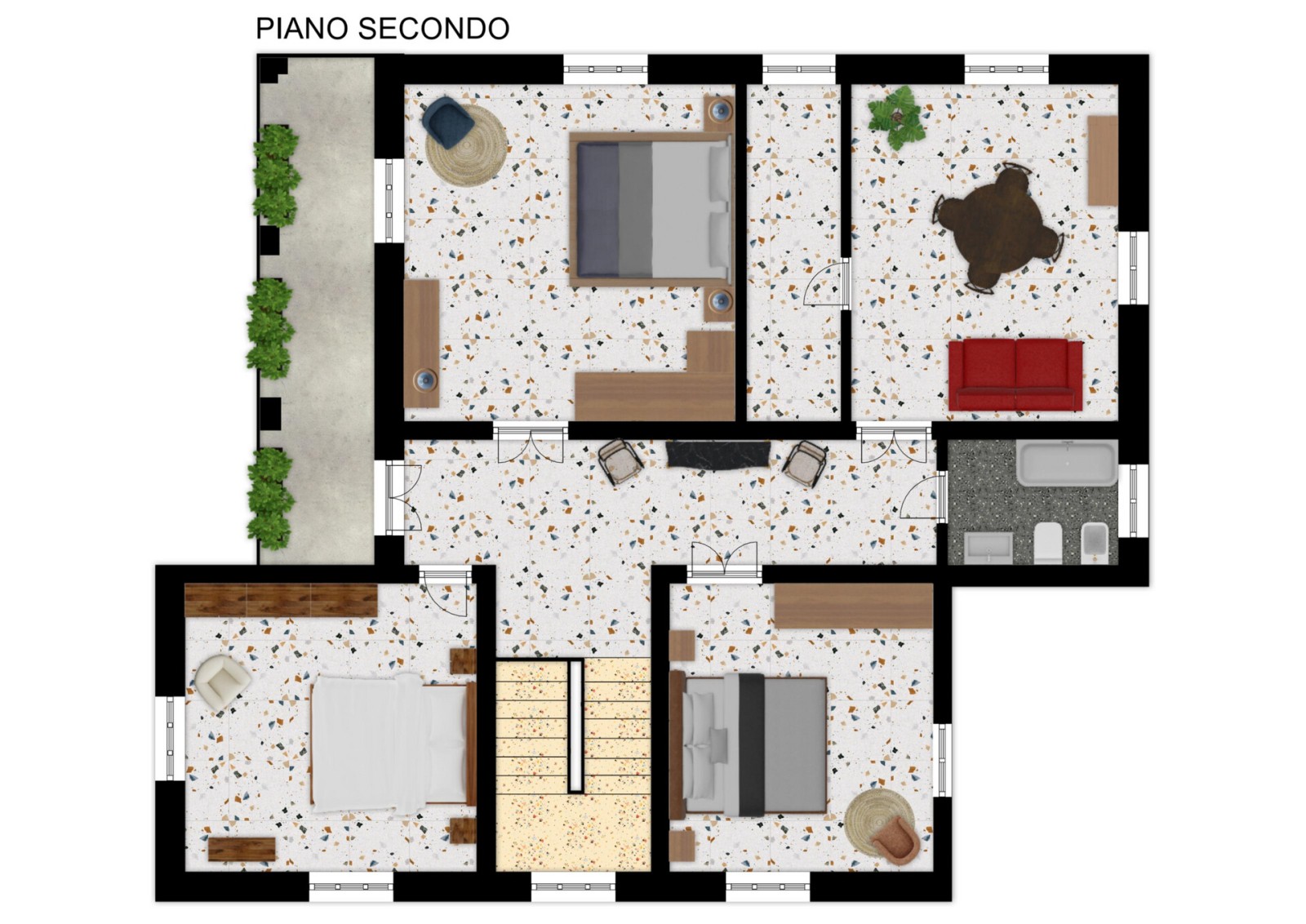 Salendo al piano superiore si apre la zona più riservata dell’abitazione con quattro camere da letto che permettono a ogni componente della famiglia di avere il proprio ambiente personale, insieme a un secondo bagno che rende la routine mattutina molto più fluida.
