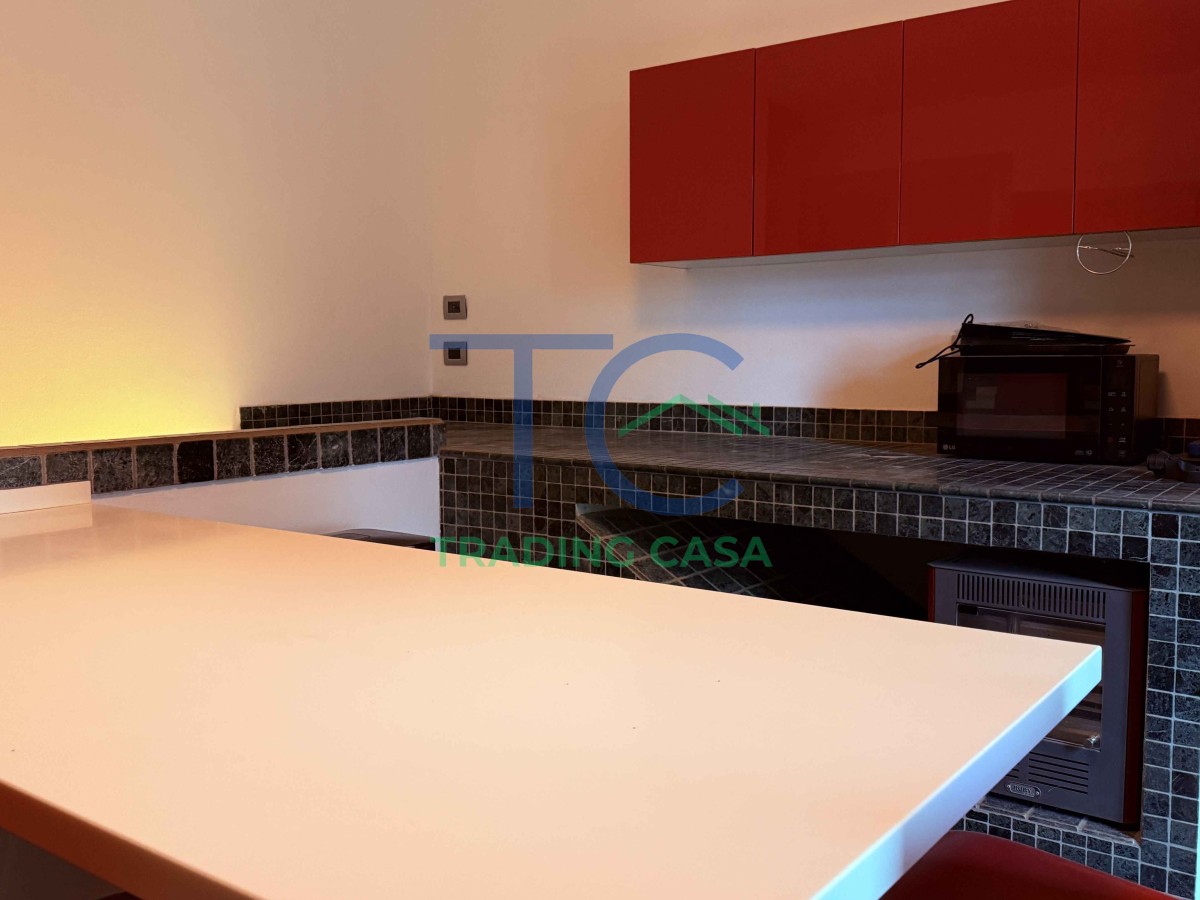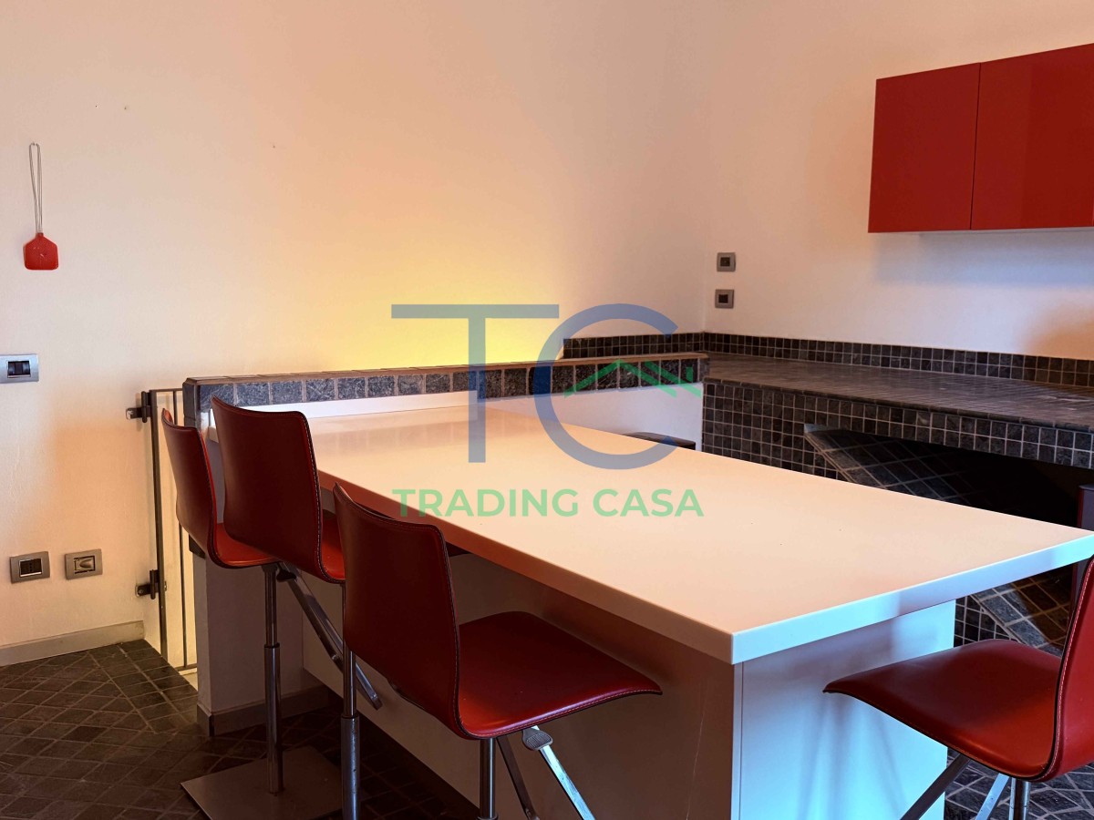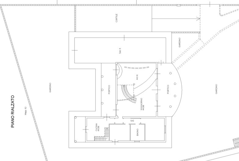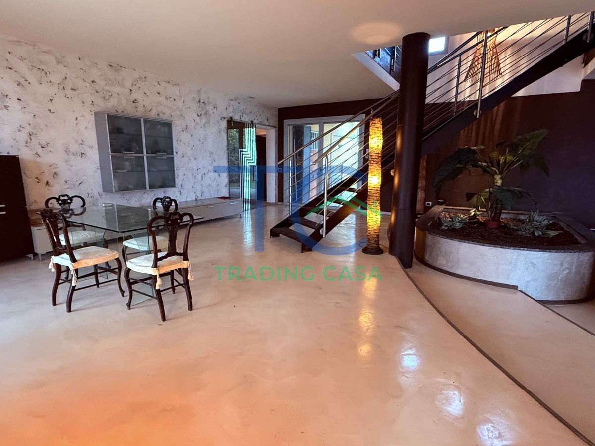 Il portico d’ingresso introduce subito in un grande salone scenografico, dove la scala centrale a vista diventa protagonista e il camino a pellet accompagna i momenti più raccolti. Qui la luce, le altezze e le proporzioni trasmettono una sensazione immediata di solidità e rappresentanza. La cucina abitabile è pensata per essere vissuta davvero, mentre le due camere al piano terra e il bagno permettono una gestione pratica e flessibile della vita quotidiana.