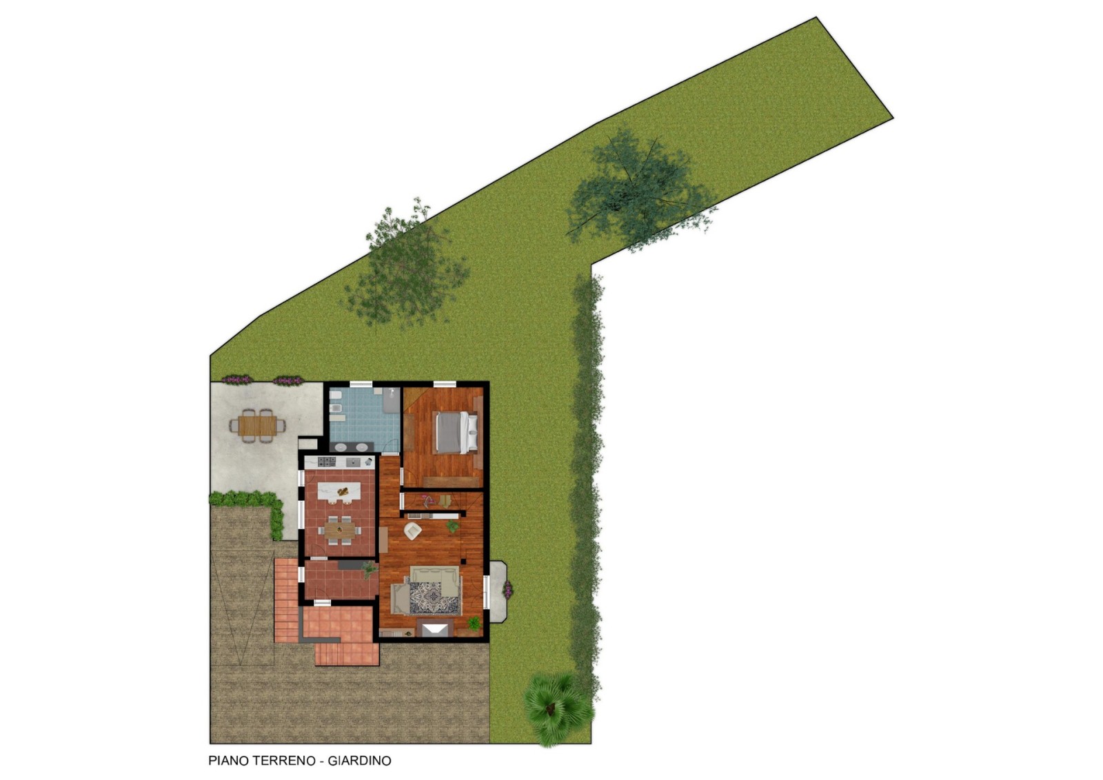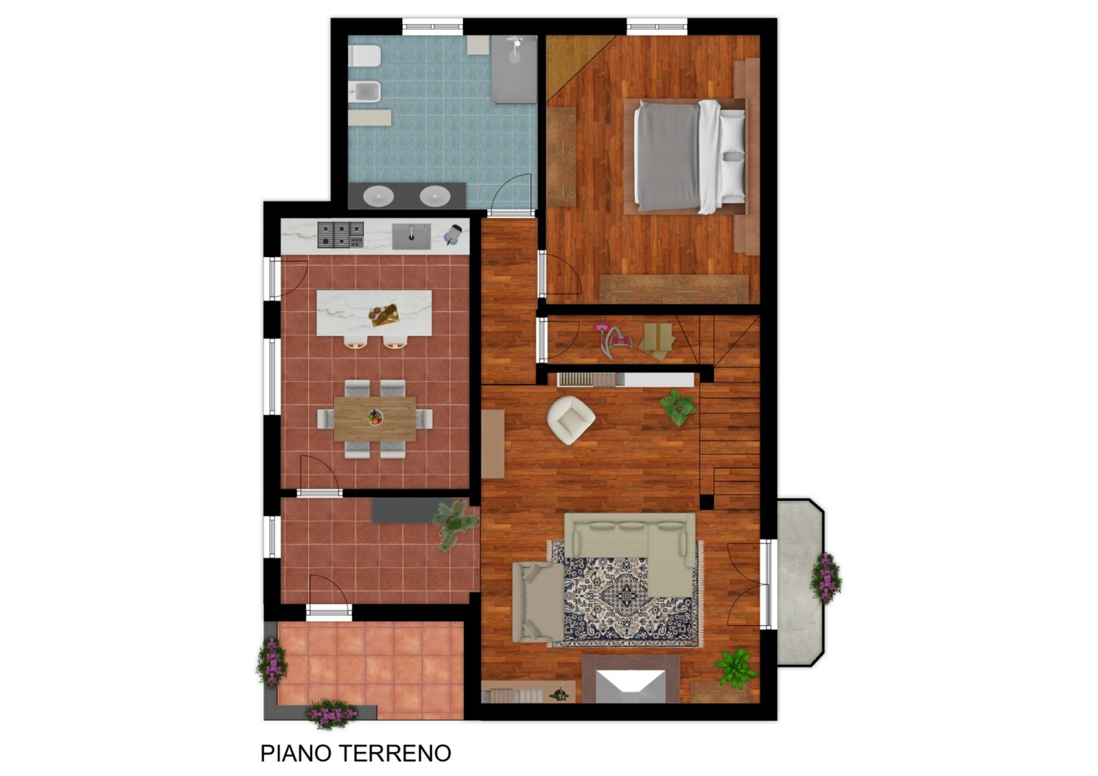 Al piano rialzato ti accoglie un ampio soggiorno con camino e balcone, una cucina abitabile con grande terrazzo coperto perfetto per i pranzi in compagnia, una camera da letto e un bagno spazioso.