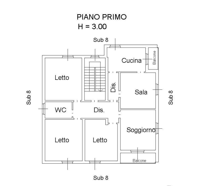 Al primo piano troviamo l’appartamento principale: ingresso, ampio soggiorno con balcone, sala separata, cucina con balcone, tre camere da letto e bagno. Ambienti generosi, ben distribuiti, pensati per una famiglia numerosa che vuole vivere comodamente ogni spazio della casa.